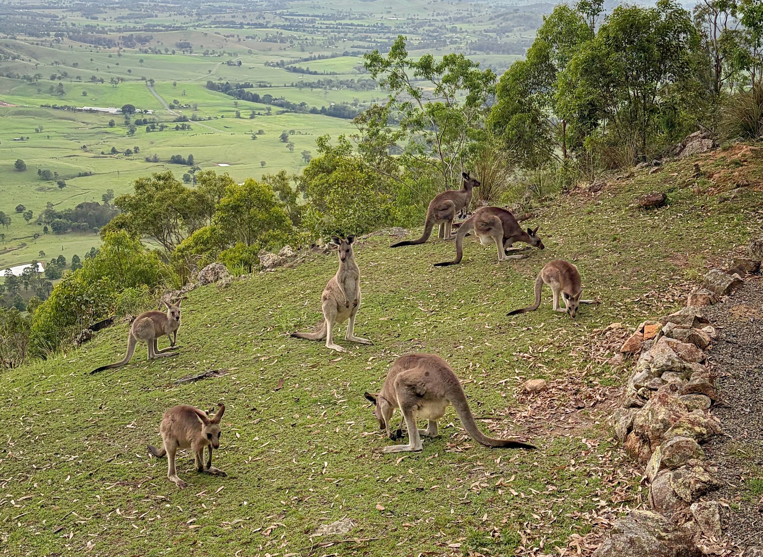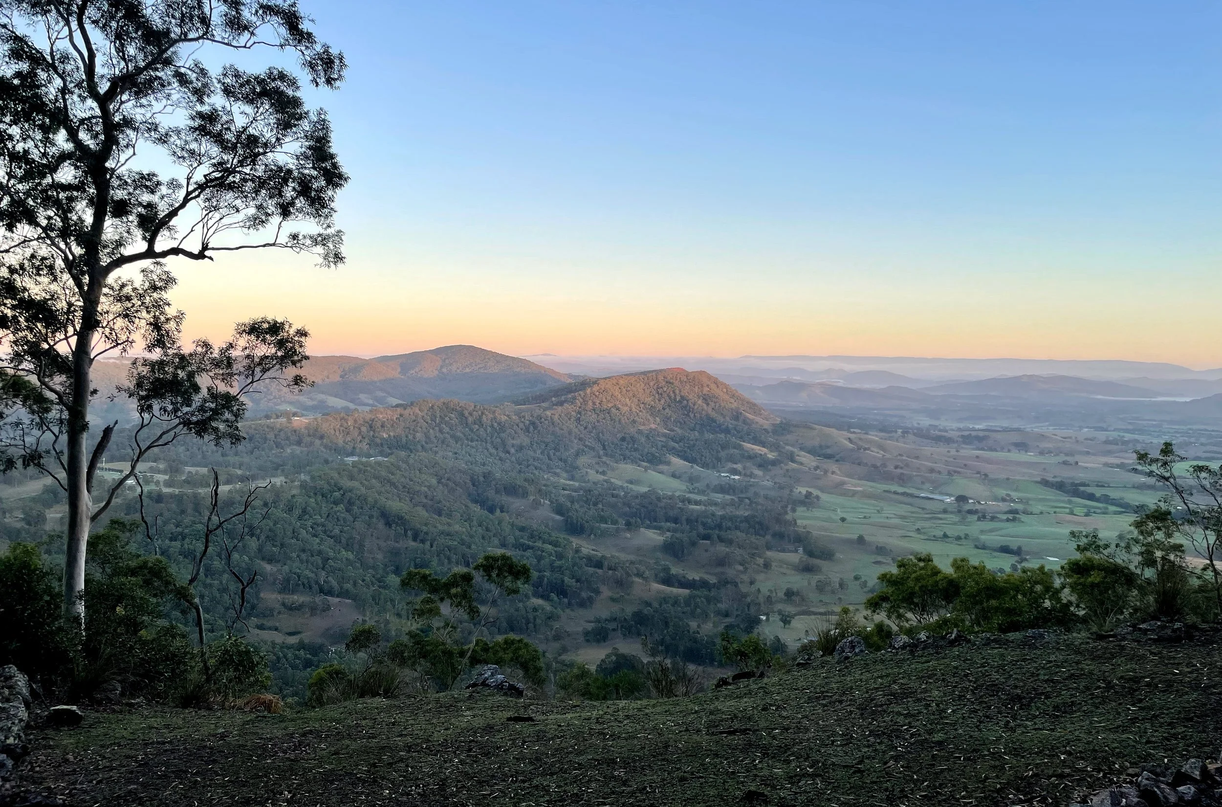 Trace the edge of the mountain along the Moonabung Trail — steep climbs, volcanic rock formations, grass trees and sweeping views the whole way. Allow one to two hours. Medium to high fitness recommended. One of the most rewarding walks in the region.